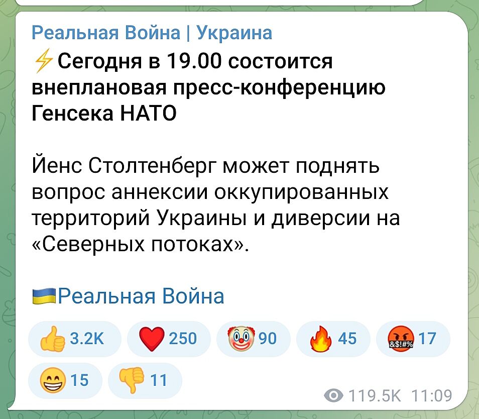 Бачила версію (слабо вірю, але), що у зв´язку з диверсією у теріторіальних водах Данії, НАТО може оголосити, що готові втрутитись у війну.