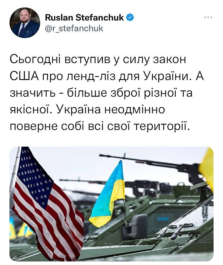 ⚡️Закон США о ленд-лизе для Украины вступил в силу, – Руслан Стефанчук.