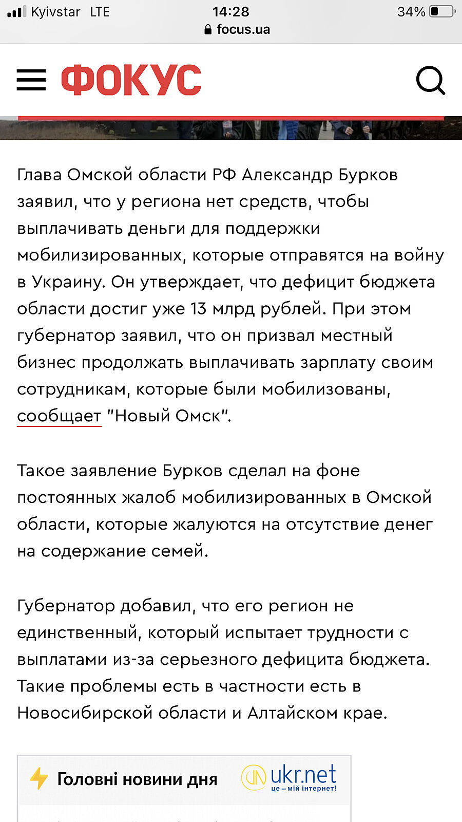 В Омской области РФ нет денег на выплаты мобилизованным.