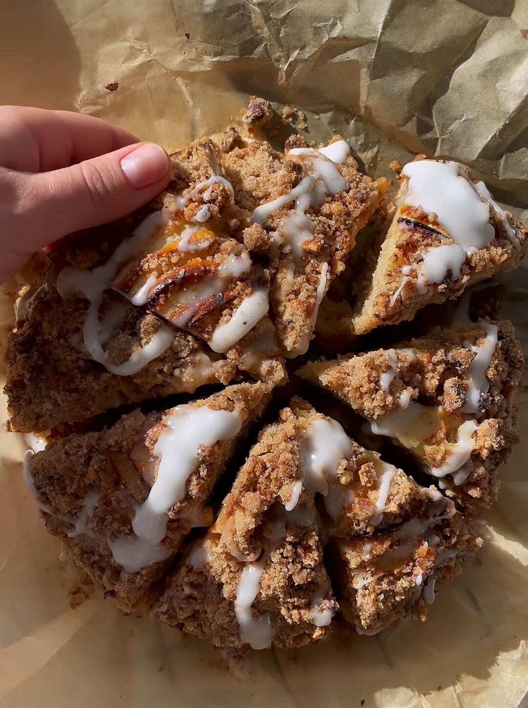 Покройте пирог слоем тёртого холодного масла. Выпекайте 200 °C около 25 минут. Перед подачей посыпьте сахарной пудрой. мучная смесь пропитается соком фруктов, а сам пирог по вкусу будет напоминать штрудель.