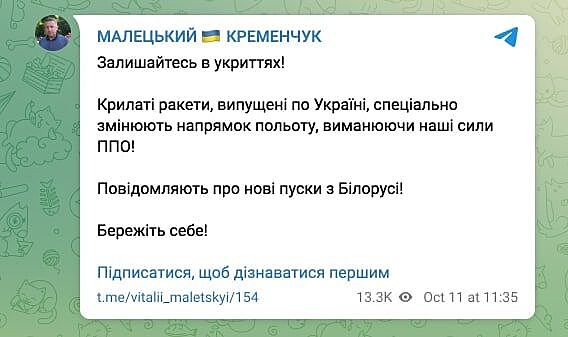 ❗️О пусках ракет из Беларуси сообщает мэр Кременчуга Малецкий. Ракеты, выпущенные по Украине, специально меняют направление полета, выманивая наши силы ПВО