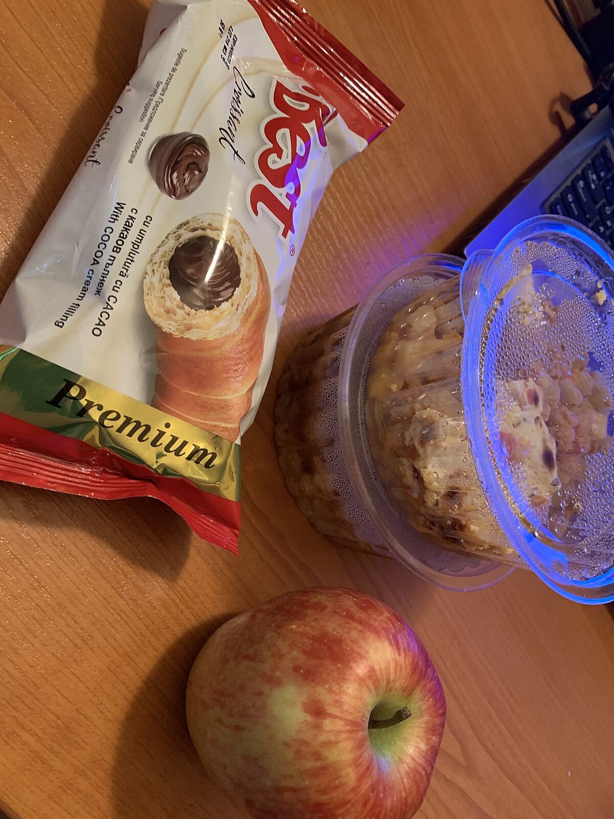 Питание привозят 1 раз в день. Сегодня рис с грибами и куриной ножкой, мусака (картошка жаренная или тушеная с мясом и омлетом сверху), круассан и яблоко