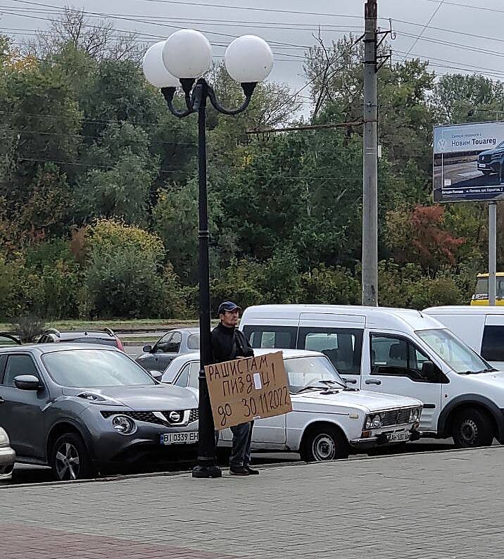 Ну мужчина заморочился, нашел лист картона, написал, заклеил лишнее, вышел к торговому центру и стоял. Значит канал, по которому он получил информацию, серьёзный