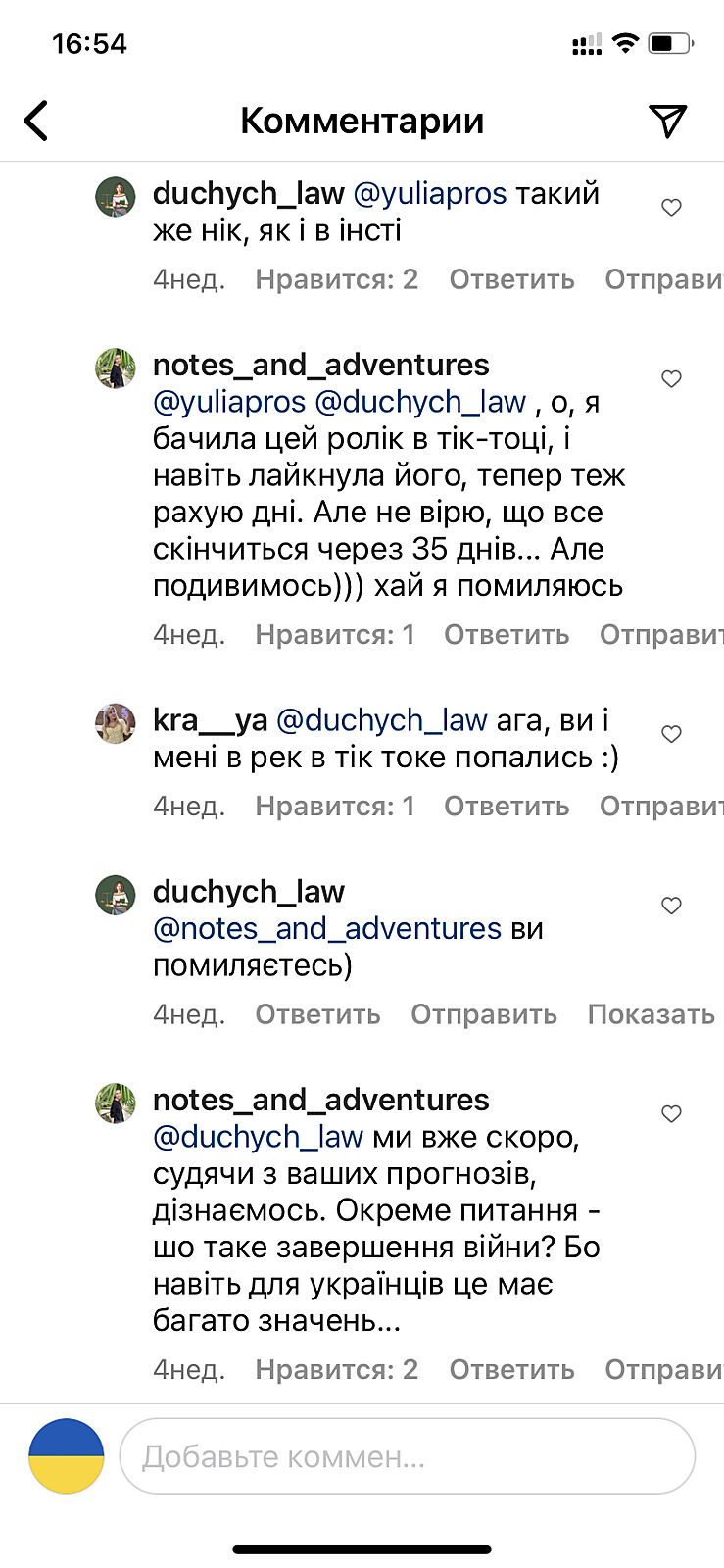 50 тыс. подписчиков и инсте за месяц и почти все ее просят продолжить вести блог и анализировать события, мы вам верим, что просто что-то пошло не так и прочее…А называется все это у неё , что касалось окончания войны с датой20 октября- в актуальных -эксперимент. Над людьми и их чувствами она ставит эксперименты.