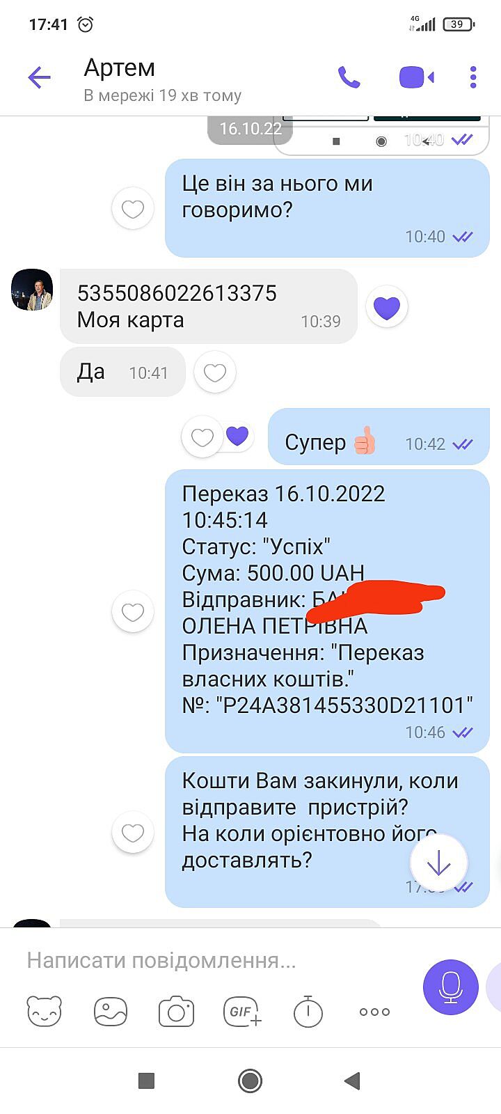 Прошу, дивіться скріни. Ще є голосові повідомлення жінки, можу вам скинути. Відразу поясню, чого сума розбита: бо дядько спочатку сказав 500, а жінка сказала, що мало, треба ще 850