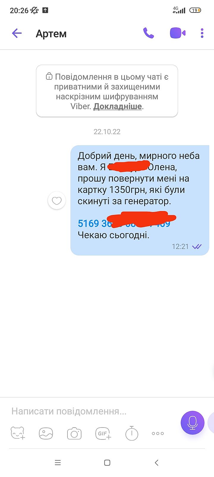 Чоловік попався на вудку, скинув передоплату за генератор 1350грн(з моєї картки), і все, заблокували. Мене теж заблокували,як написала. Але продовжують виставляти ті червоні генератори, і з тими самими мобільними номерами, але з інших акаунтів. Кому скучно - можете їх потролити. Домовлялися по телефону, ось їх номер картки 5355086022613375. В мене збереглися голосові повідомлення від дівчини,вона там чоловікові розказувала туфту, на жаль, сюди не можу прикріпити. Якщо комусь треба, можливо щоб розпізнати голос - скину на Вайбер. Ці дві особи - ніби чоловік і жінка, він розказує, що зараз за кордоном, а жінка відправить. Жінка каже, що треба передоплату на обриштовку, інакше не буде відправляти (пс- на наложку типу згідні), бо "ви не заберете, а мені прийдеться оплачувати". Можливо комусь пригодиться)
