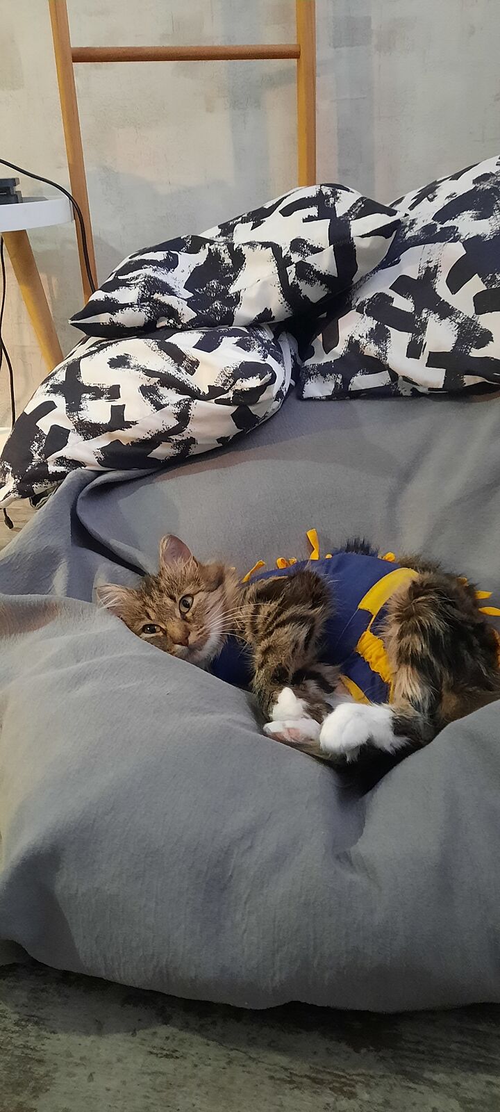 Попона после стериллизации. У нее было 5 котят, она родила в подвале. Соседи и друзья разобрали котят
