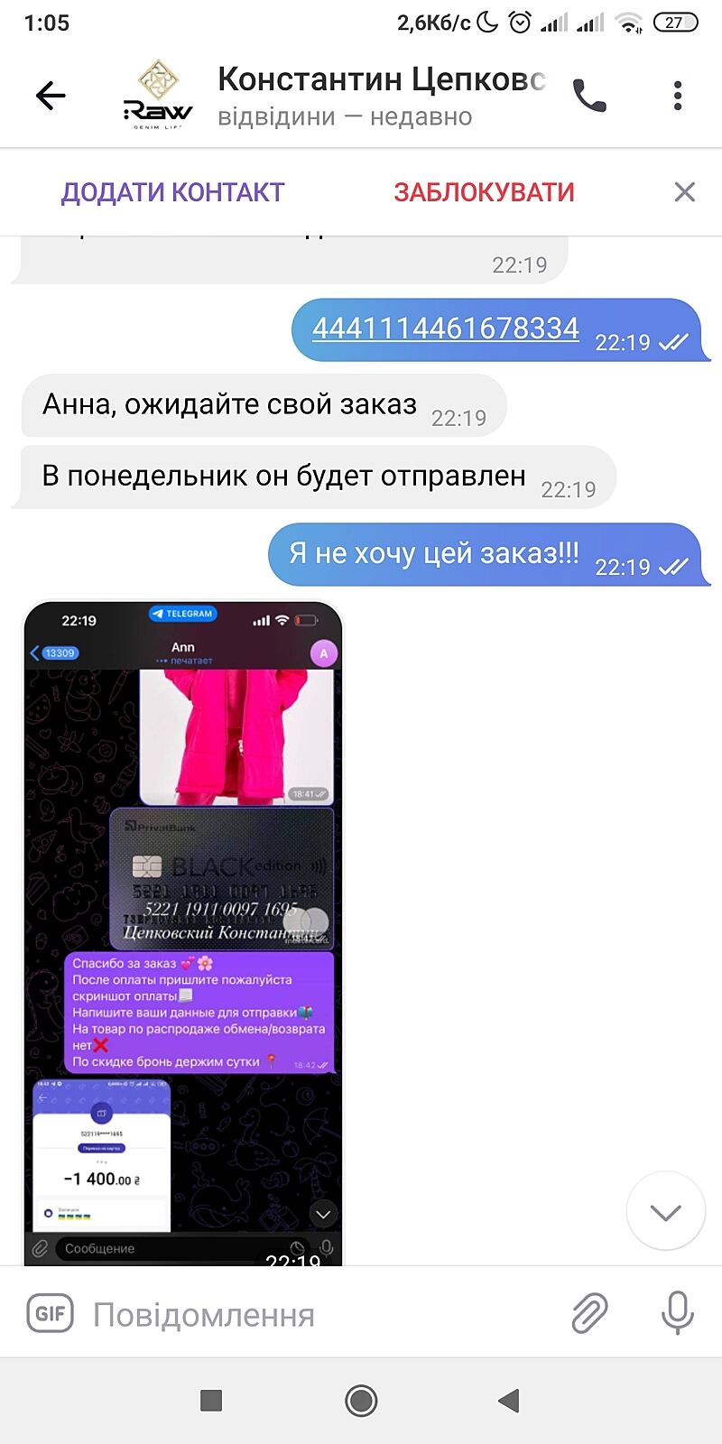 Ситуація така: замовила костюм, внесла аванс, потім виставили товар по розпродажі, який сподобався більше, попросила змінити замовлення, мені відмовили, почали ображати, кошти відмовляються повертати.