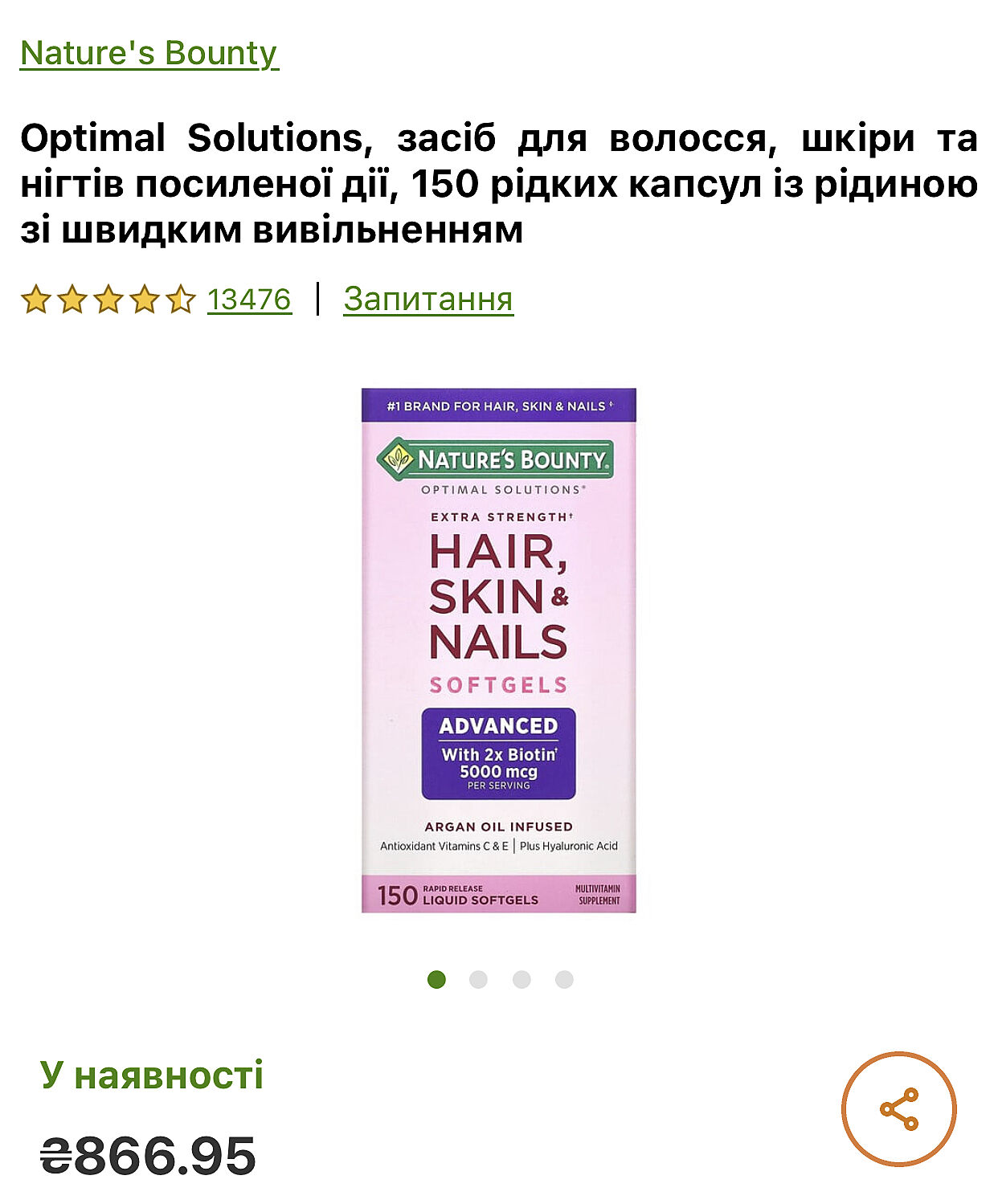 Вітаміни для волосся, нігтів і шкіри Optimal Solutions, nature´s Bounty Детальніше:
