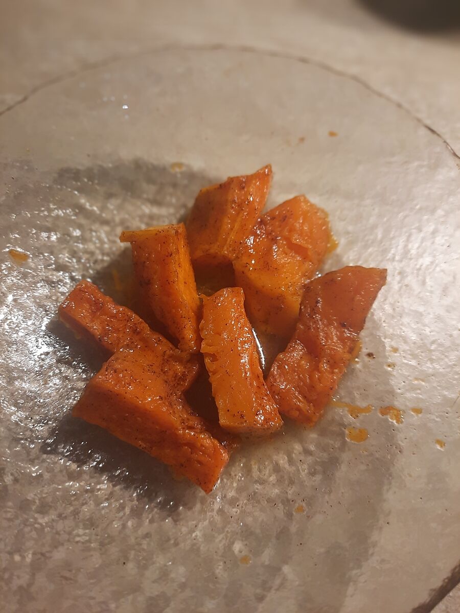 Растопить сливочное масло, смазать форму. Кубиками тыкву, предварительно посыпать обильно сахаром с корицей. Уже в форме кусочки немного смазать мёдом, и полить остатком топленого масла. Минут 40 на 180 °.