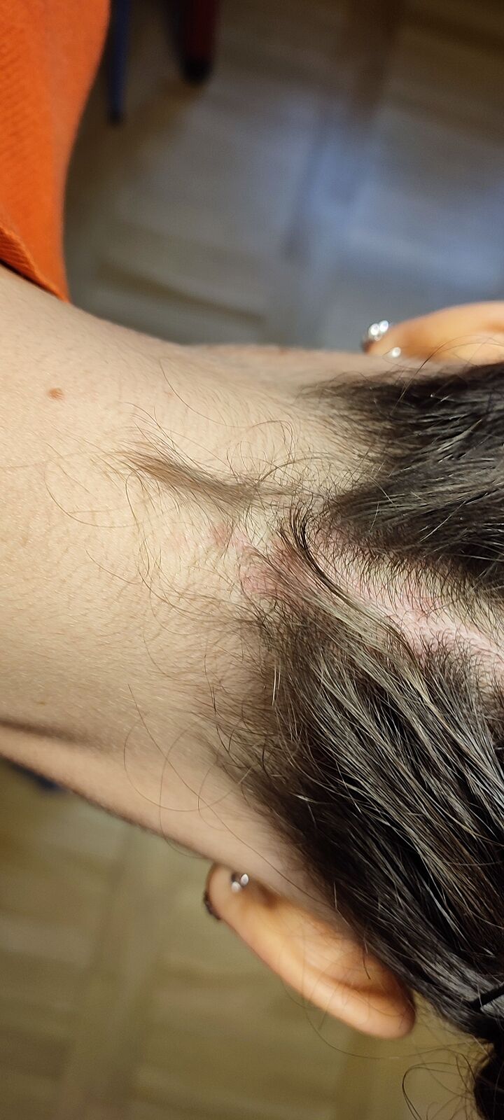 Здравствуйте. Никогда подобного не замечала... Сделала прическу с пробором впервые с начальной школы. Сфотографировала посмотреть как вид сзади и в шоке... Немного зудит. Начало после того как я там руками трогаю. Перхоти никогда не было. Но пугает такое уже несколько дней. Может это после бассейна?