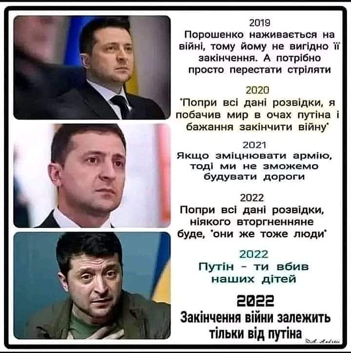 ...йому нічого не заважало відгородити більшість країни від війни тоді, і оцього всього зараз. Як би не відносилися до ПП (є до нього питання,але він тіг країну в потрібному напрямку,в чому зараз більшість переконалась на своїй дорогоцінній шкурі), але для нього цінність життя свого населення- було в приорітеті. В вину йому ставлю одне- що занадто відгородив людей від війни тоді, бо відійшли від переляку,від’їлися, наслухались массованої інфроатаки на ПП (цікаве запитання,кому ж було так вигідно вгатити дурні гроші в оце все,бо безкоштовно у нас тільки котенята народжуються) і захотілось закінчити війну одним клацанням пальців... А так не буває,коли поряд країна неадекватів. От тепер і вигрібаємо.