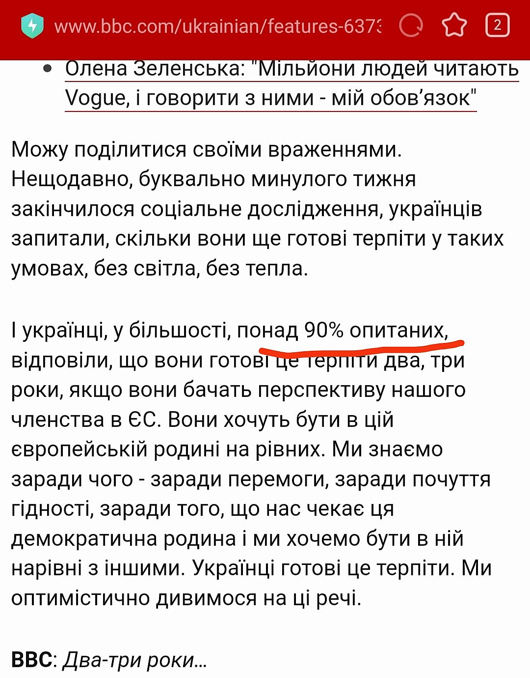 Елена Зеленская сказала,что 90% жителей Украины готовы жить с отключением света 2/3 года ради членства в ЕС( интервью для bbc). У меня нет знакомых которые бы принимали участие в этом опросе. Девочки, вы готовы?