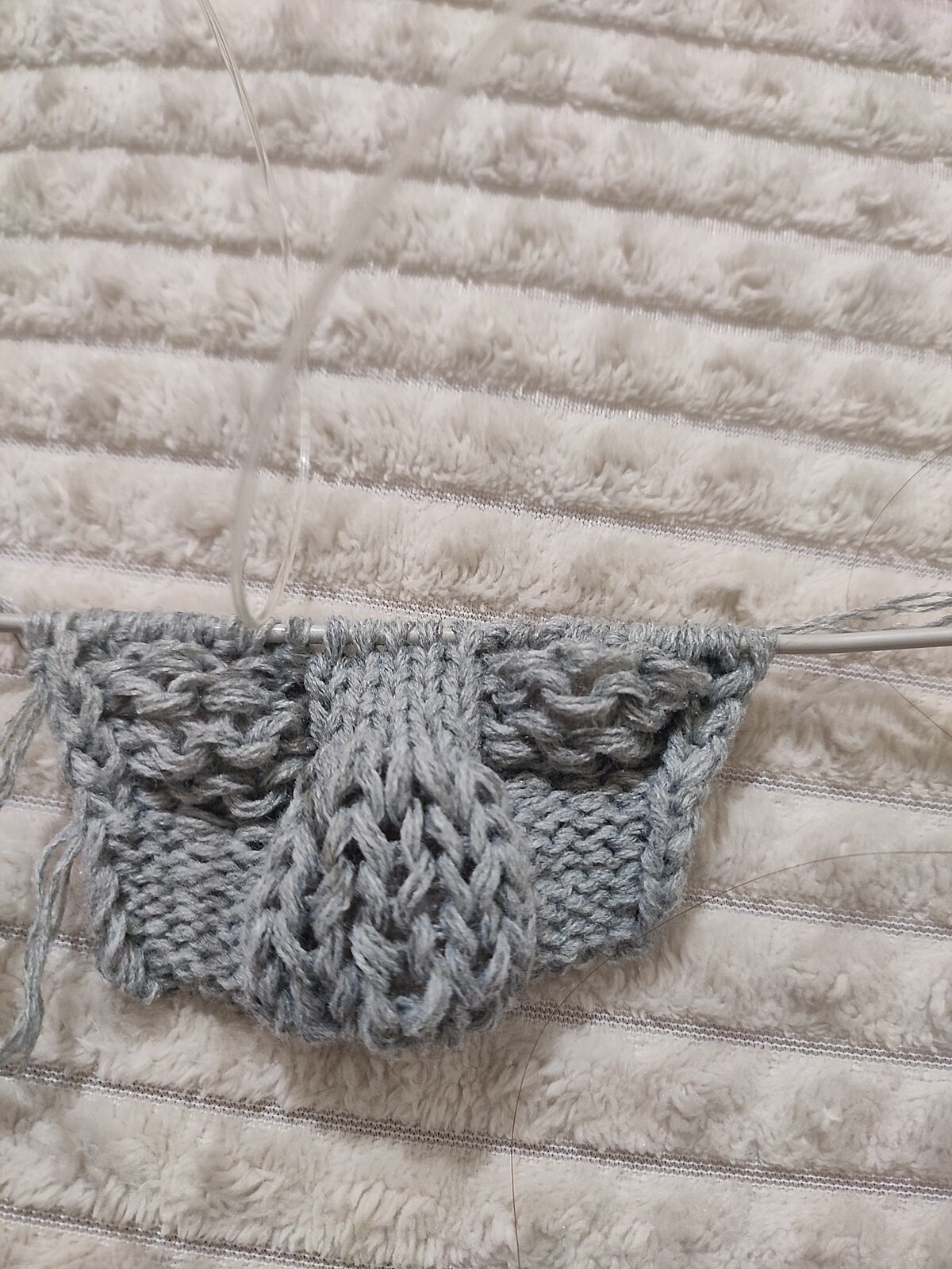 Тааак, я зрозуміла. Спиці не міняєте, бо то гемор ще той. Вяжете так. Все тонкими спицями. *Лицьова, накид, лицьова, накид, лицьова, накид, лицьова накид, лицьова, 5 виворітних. В другому ряду при провязувані лиц. (Вони вже будуть виворітними) накид скидуєте зі спиці. Коли їх провязуєте, то також робите накид. Зрозуміли?