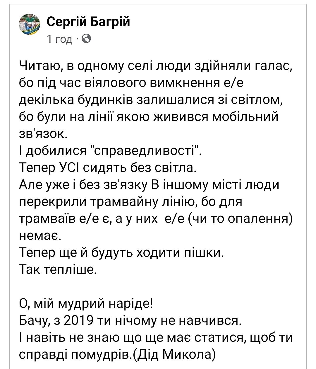 Саме так, сиджу. З усім цим. Власне я це сама для себе створила і сама з ним сиджу. А так у нас сьогодні світло давали двічі по 40 хвилин. І щоб я по чужих вікнах заглядала, замість дбати за свій комфорт і свою родину, то теж сиділа б, як усі ’ знедолені’. А так сиджу ексклюзивно. Що і вам раджу. Але ви чомусь ображаєтесь. І замість купити газовий балон і плиточку на одну конфорку для ’ теплої їжі’ шукаєте проблем у сусідах. То їм, ще раз напишу, начхати. Вони для себе вже все зробили. Зробіть і ви для себе. Ну хоч шось.
