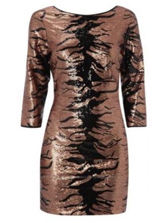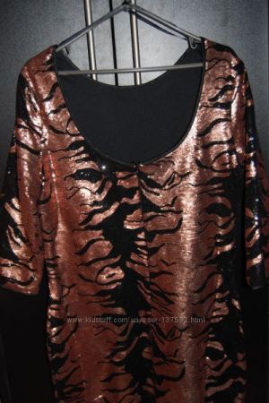 Полностью расшито мелкими пайетками. Спинка приоткрыта глубоким круглым вырезом. Застежка-молния (сзади). Длина - середина колена. Можно носить как тунику. Замеры: ширина между подмышками - 50 см, ширина в бедрах 52 см, длина платья от линии плеча до низа 89 см, рукав 3/4. Длина от выреза до низа 84 см, ширина в плечах 42 см, глубина выреза сзади 19.5 см . Почти не тянется из-за того, что расшито пайетками.