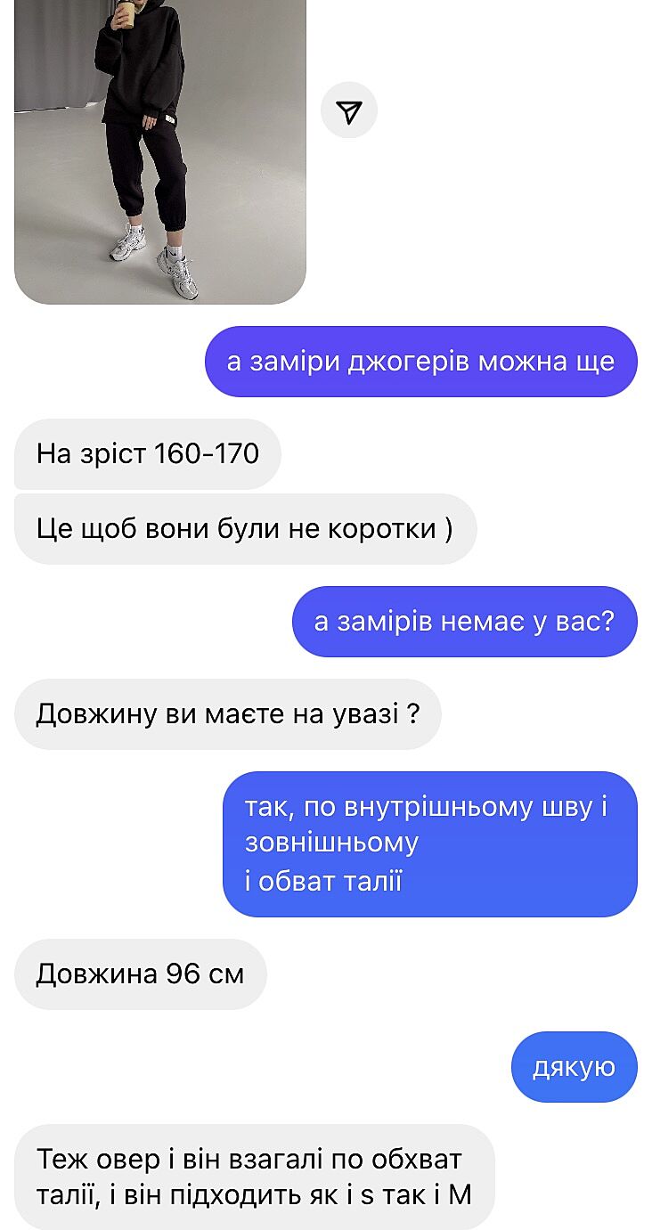 Одного разу замовила теж схожий костюм, 100 разів уточнювали параметри , писали, що в них забвльшені розміри і мені треба 100% брати М, хоча ношу я Л-Хл. Я просила заміри, скинули розмірну сітку, по якій дійсно треба М, замовила, а костюм малий