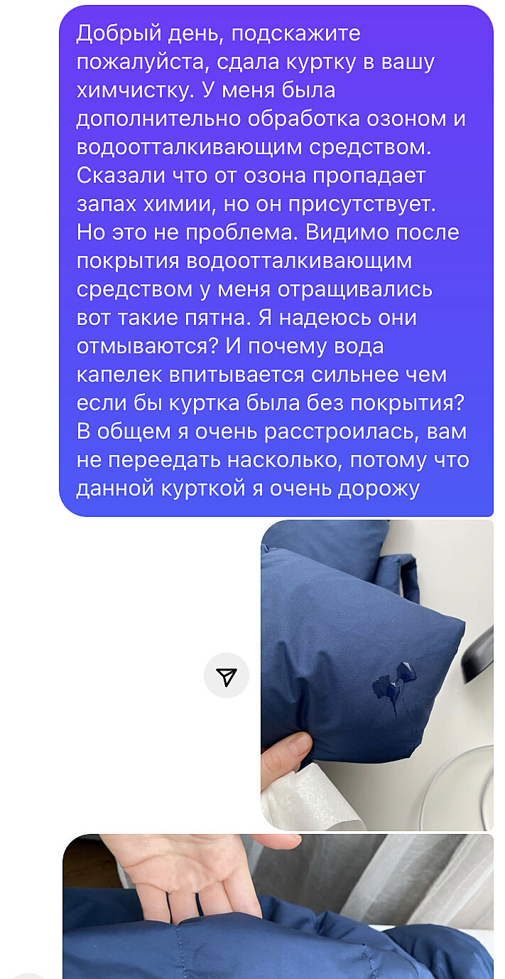 Я им выслала фотографии и описала свои проблемы, без наездов, не знаю на что рассчитывала, но думала вдруг повезёт, предложат частичную компенсацию за то что куртка не стала водоотталкивающей. Предложили мне принести куртку на доработку. Но я не хочу этого делать, так как боюсь чтоб ещё хуже не сделали и ждать две недели снова не хочу. Даже не знаю зачем написала им, но с другой стороны такое позволять делать химчистке в дальнейшем ненормально, должны же какой-то сервис предоставлять и отвечать за косяки. Изначально мыслей идти нести ее снова к ним, даже не было, раз обожглась-больше не хожу в такие места, теперь думаю, может все таки отнести? Но опять сидеть переживать… на рукавах внизу какие-то линии появились на складках (снаружи не видно), вдруг потом они ещё где-то проявятся. Надеюсь это тоже от того покрытия, сейчас буду пытаться убрать водой.