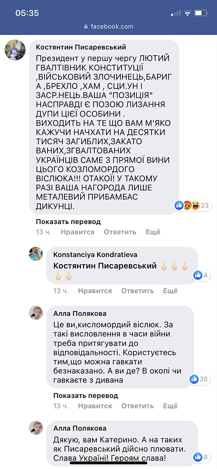 Она заявила, что ее аккаунты взломали, и она все утро искала злосчастный комментарий, но поиски успехом не увенчались. Однако, именно о ситуации с Екатериной Полищук (’Пташкой’) ничего не сказала. Написала только, что уважает всех защитников и защитниц родины.