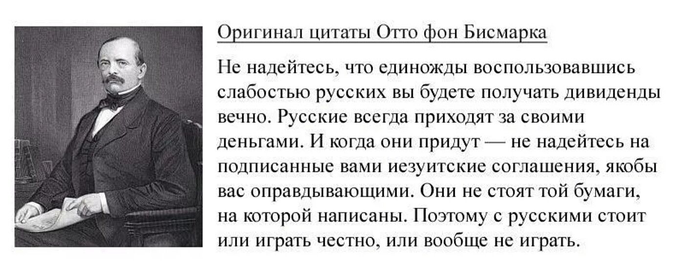 Вы если уж взялись цитировать Бисмарка,то пишите его цитату дословно,а не переклад в вольной форме,как это вам больше нравится,ну или тогда не ставить значок (с)