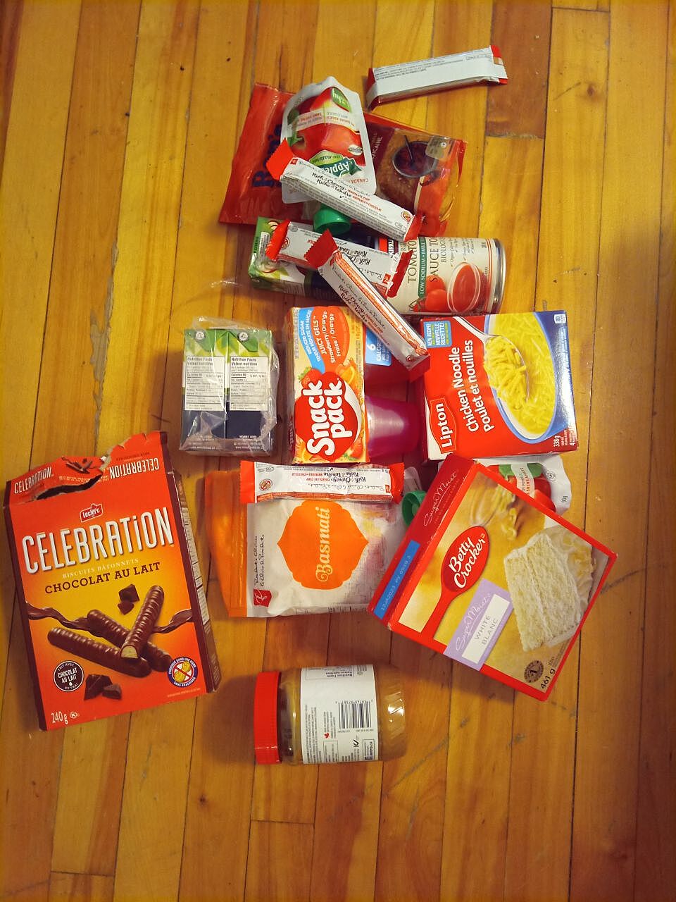 По разному, обычно две сумки набивают, нести тяжело... яйца, консервы, фрукты, овощи, хлеб, молоко, иногда сладости... Есть вообще крутые футбанк за 17 баксов полная тележка, но мне не подходит по времени, я на работе да и без машины не утащить то добро....
