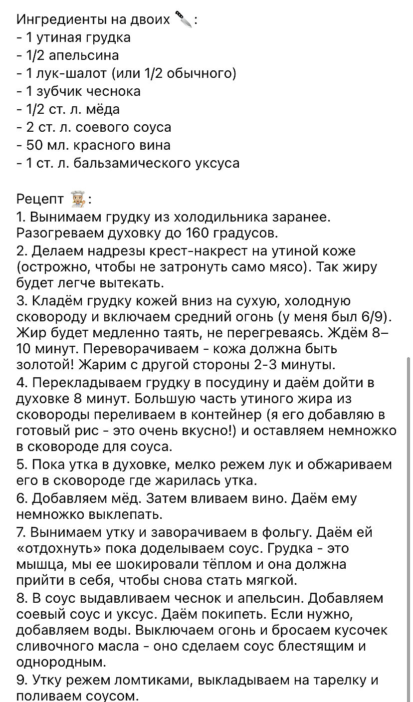 Здравствуйте. Девочки, кто готовил утиную грудку, пожалуйста, напишите рецепт. Я ее никогда не готовила, и мне кажется, что это сложно.Муж купил в магазине, принёс и вот вам, делайте что хотите. Спасибо кто ответит.