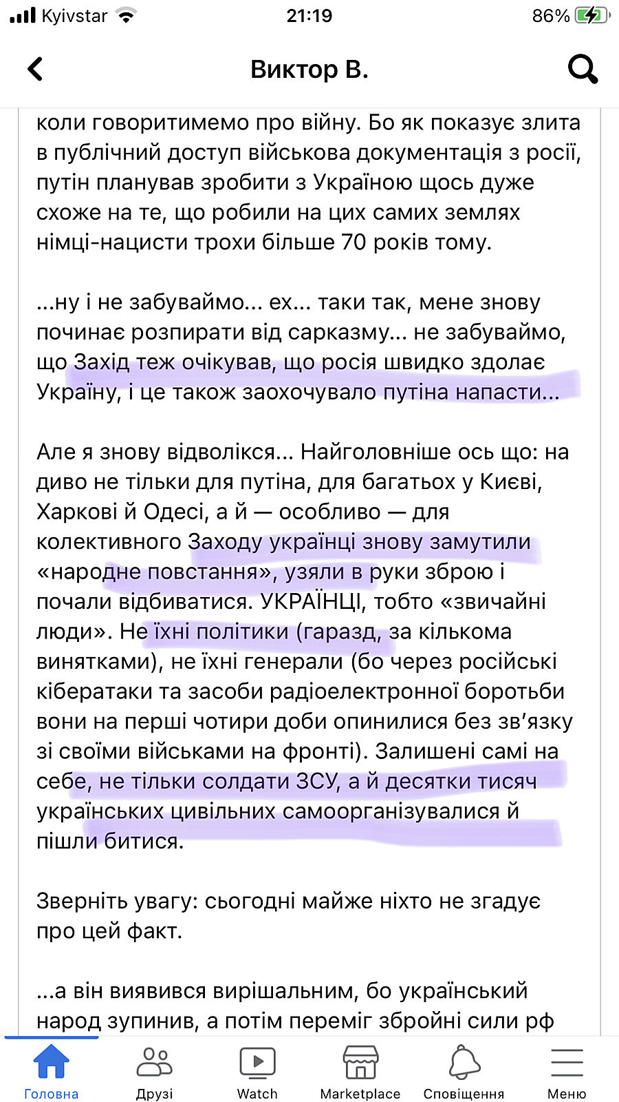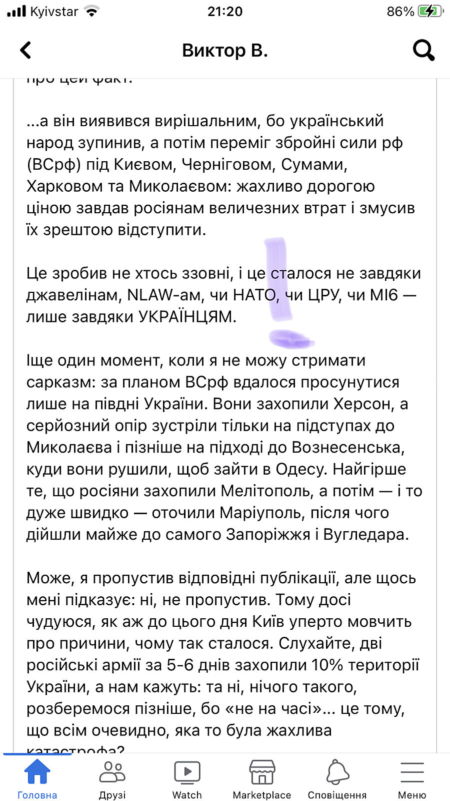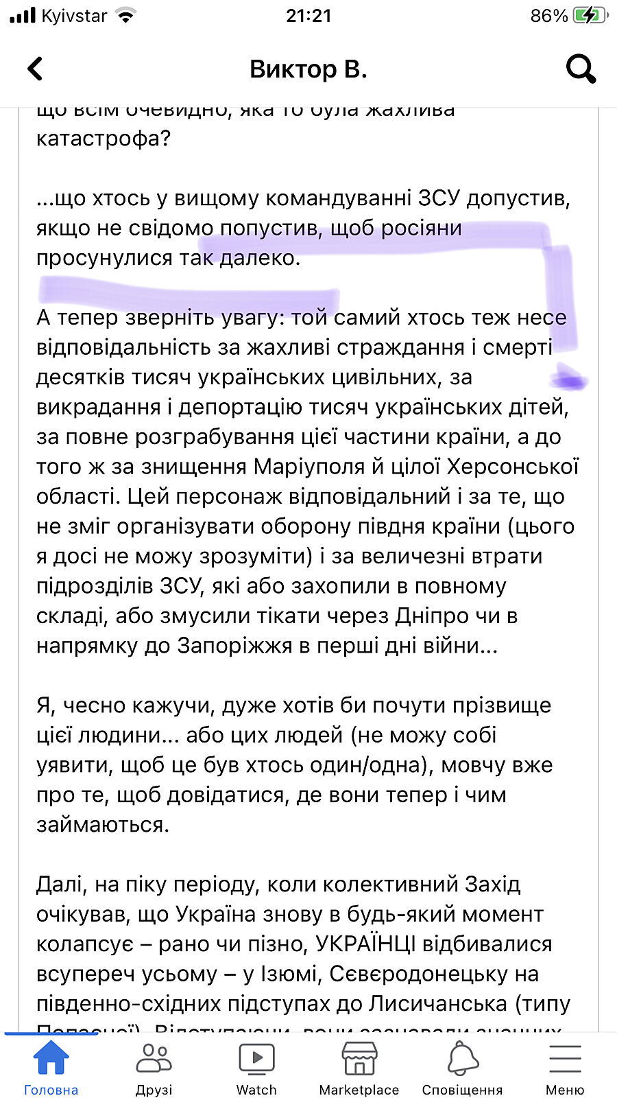 +100. І це лише одна зрада з тисячі. Мені хочеться почути відповіді на питання ’хто розмінував Чонгар’, нащо розводили війська на Донбасі з укріплених позицій, чому ігнорували попередження про вторгнення провідних розвідок світу, чому були згорнуті ракетні програми і багато іншого. І воно все на часі, як би хто не казав