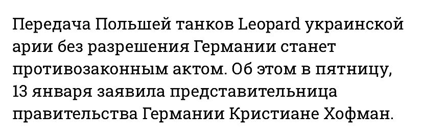 Смотрела сегодня новости я в Англии , по новостям UK 🇬🇧 четко сказали , что Германия запретила Польше передачу танков . В наших новостях это пока не говорят , скажут позже .
