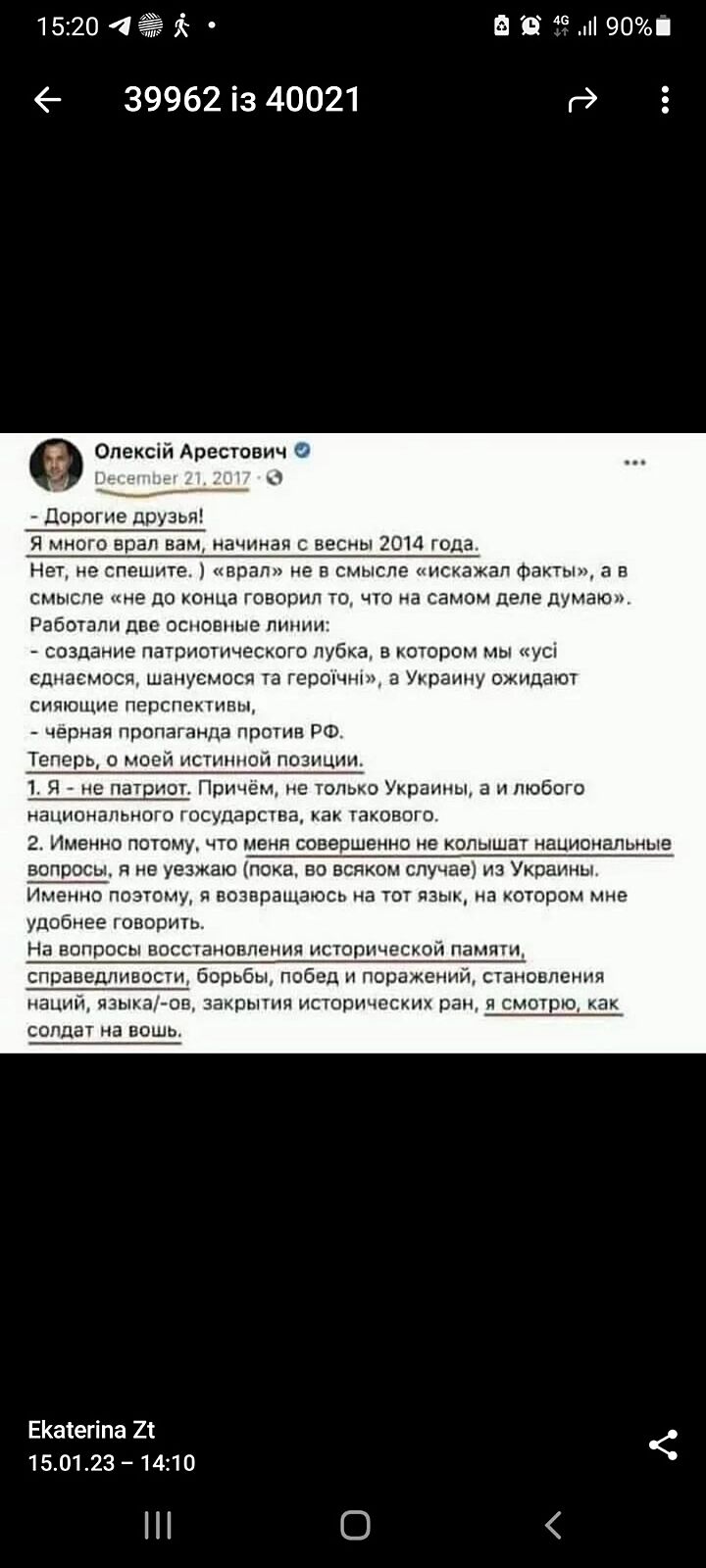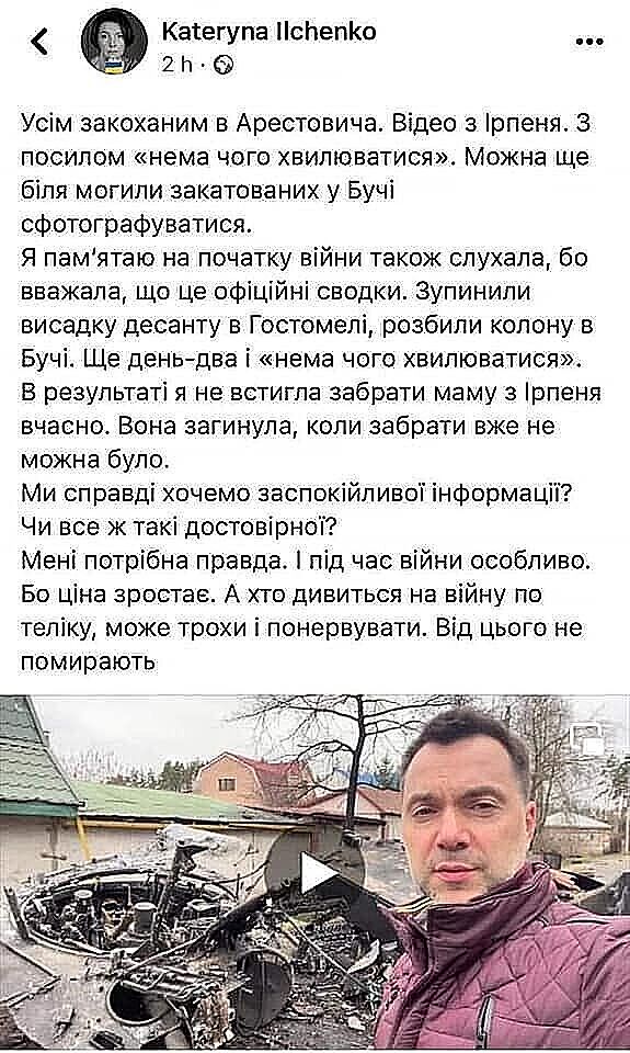 От що є то є. Я в цілому не відношуся погано до Арестовича, але корону йому давно потрібно поправити. Ну дууууже забагато пихи. Ця ’помилка’ це просто жесть. Так саме цікаве, він же спочатку написав в інстаграм пост з не то що вибаченнями, виправдовуваннями скоріше. Типу ’у мене так багато ефірів, я так втомився, інформація застала мене зненацька і я висловив те що чув недочекавшись офіційно перевіреної інформації ’. А потім видалив і написав, що він передумав і йому немає за що виправдовуватись