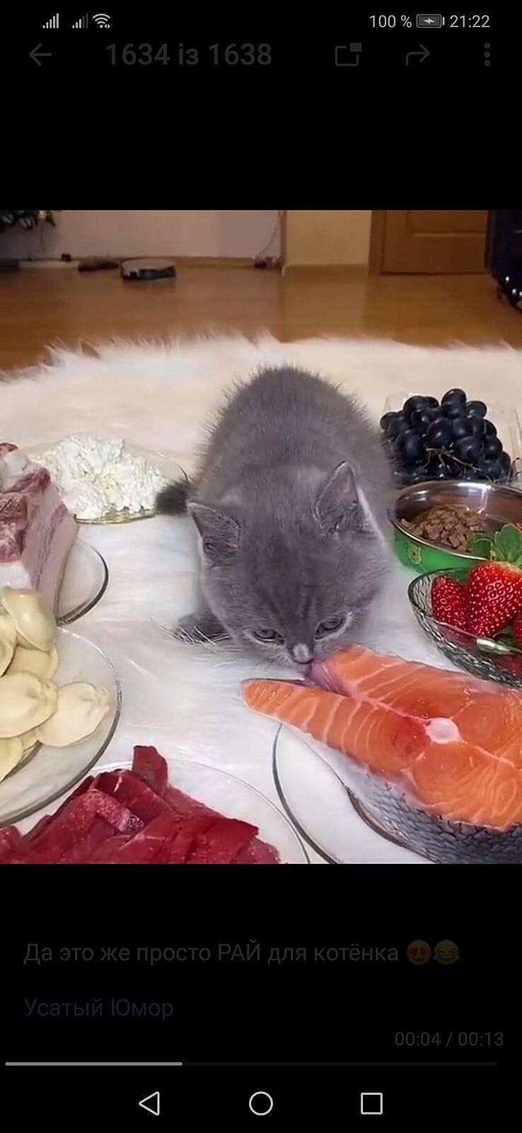 Лосось копчений був, якщо що) У нас йому пофіг, він начинку жере макову з пиріжків і макарони, виноград, хліб. Котєг на супер-преміум кормі))
