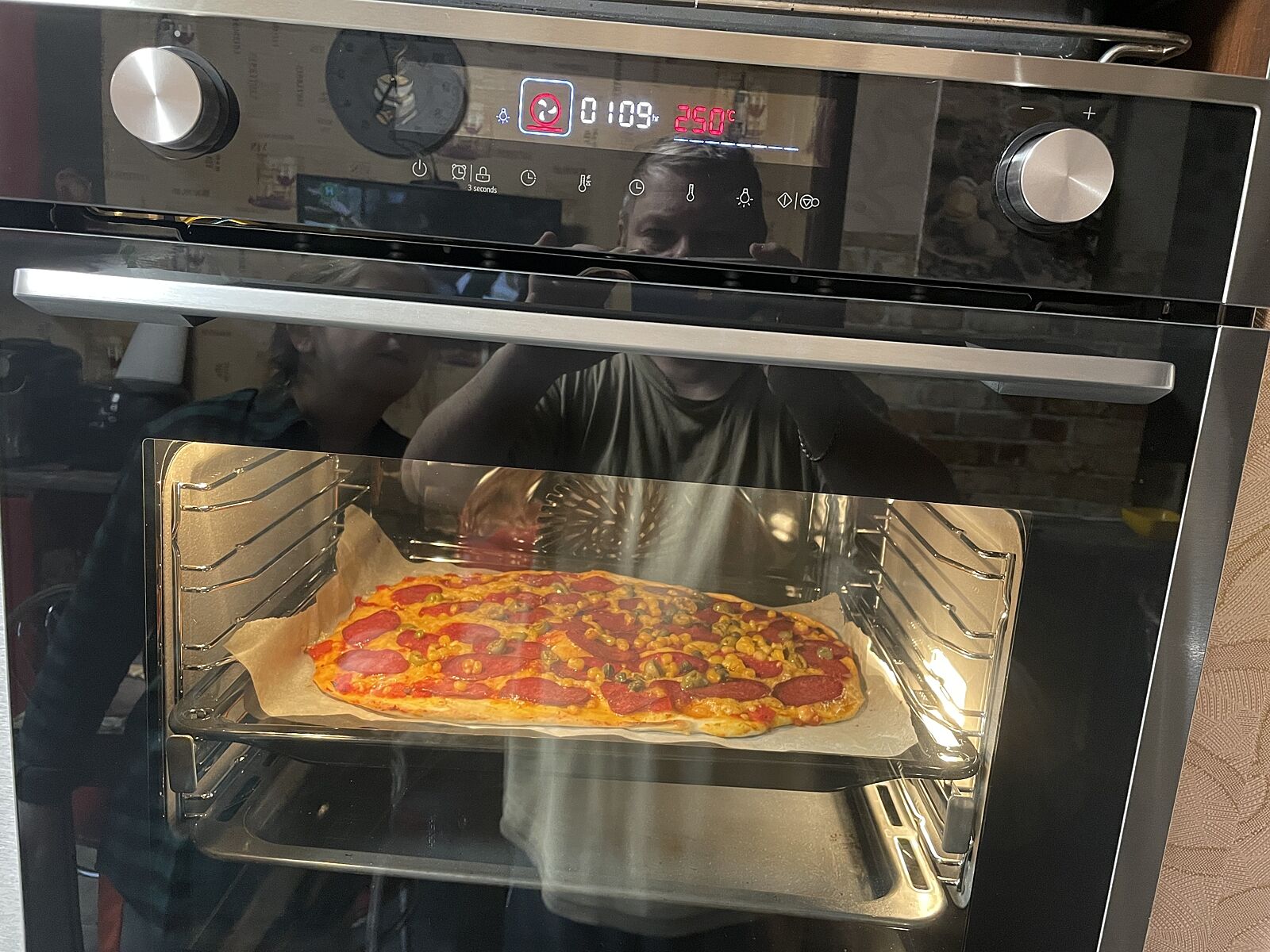 Не я делаю 2 пиццы по ширине на пергаментной бумаги , ну и по длине противеня