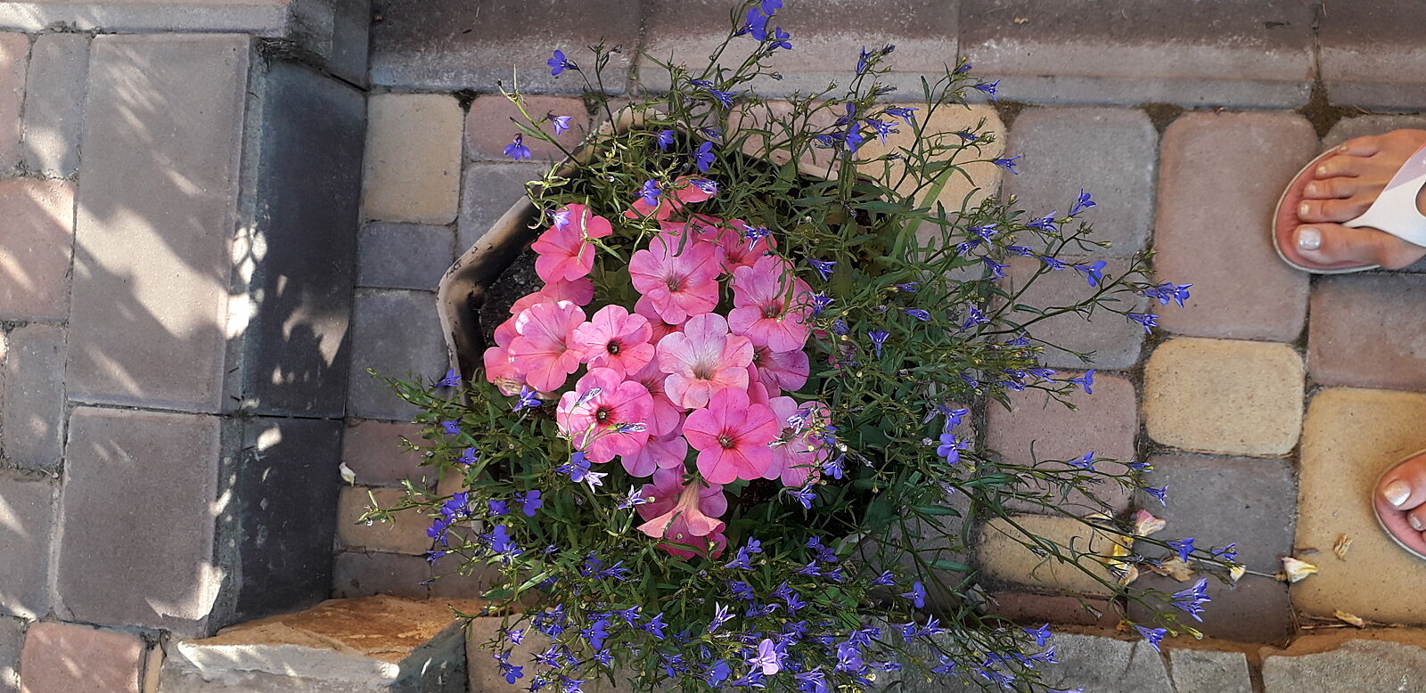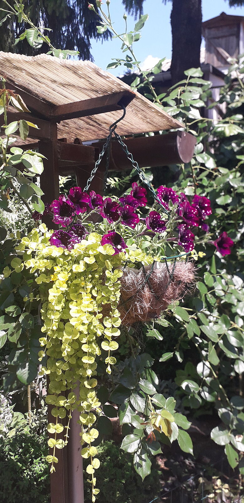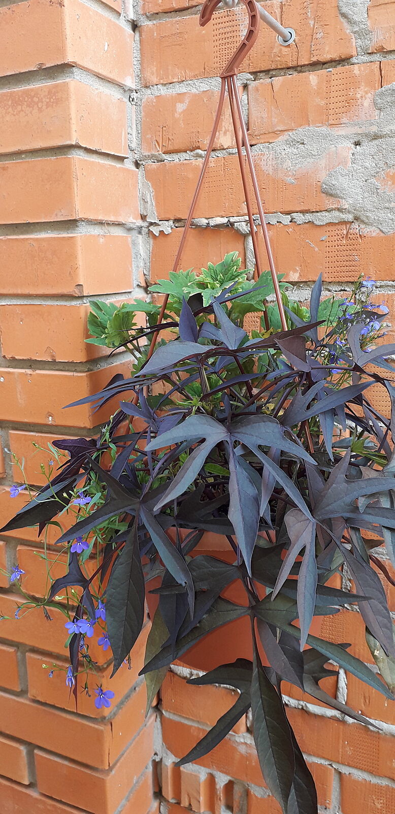 Кроме петуний в вазонах пеларгонии и фуксии на улице. Петунию подбиваю лобелией и алиссумом. А в тени-полутени подвешиваю ипомею батат плюс колеус - шикарно просто)
