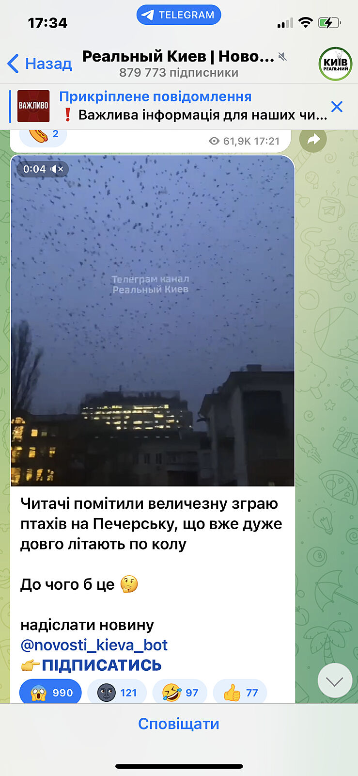 Мене більше лякають в Києві інші явища - веселка взимку та лебеді. Перед початком війни, 18 лютого була така сама яскрава подвійна веселка і на Оболонь (здається) прилеліло дуже багато лебедів. Символи світлі, але літні люди казали, що то до війни.