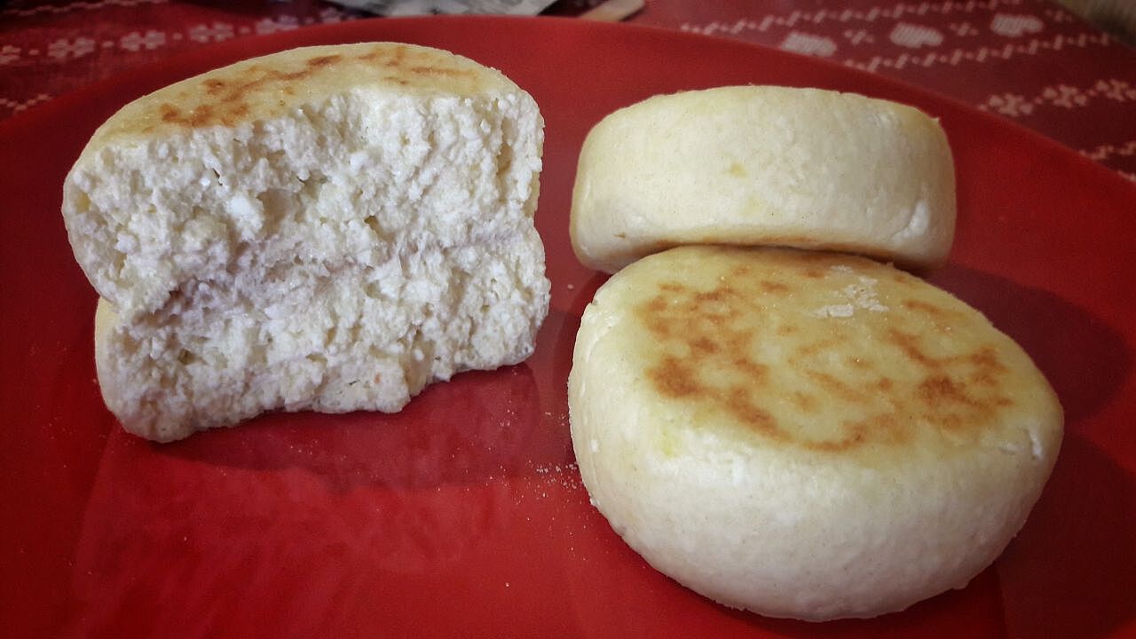 Делаю на глаз, но тесто должно быть липкими. С липкого теста делаю шарики, а расплющиваю их на тарелке с мукой, жарю на среднем огне, без крышки. В тесто ложу манку и муку.