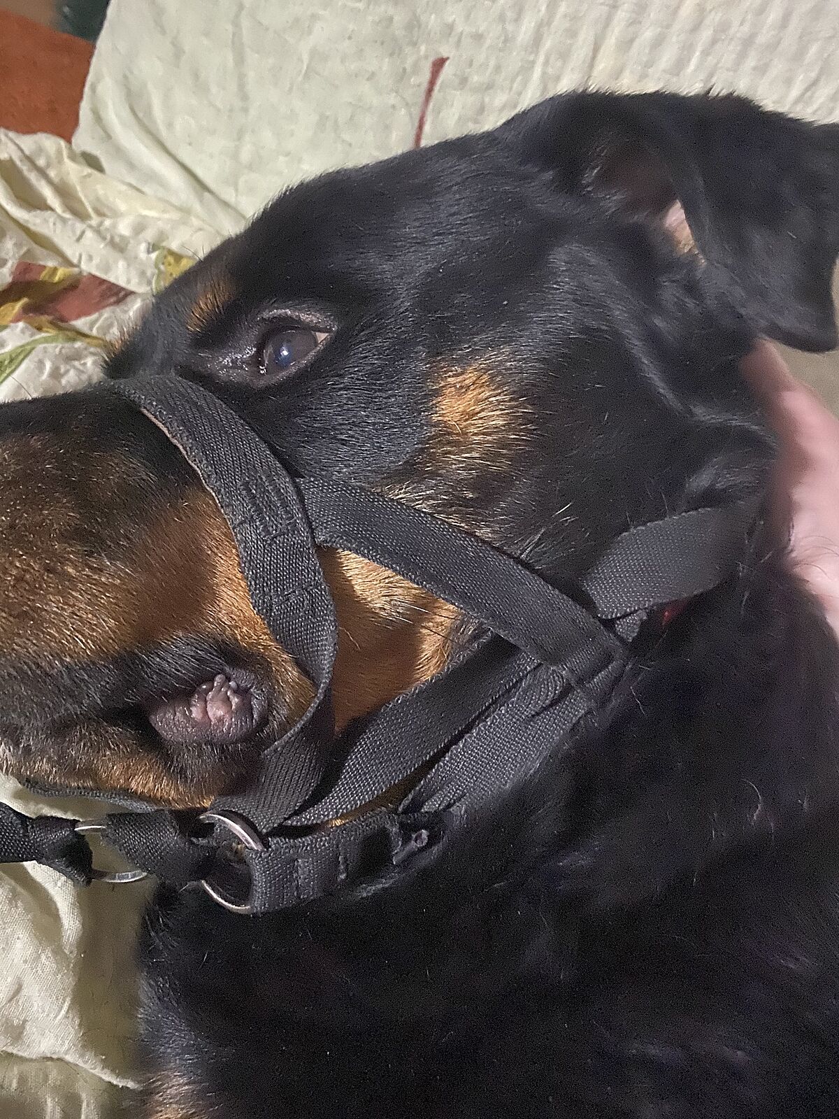 У Вас под мордой, в кольце для поводка, маленькая веревочка с карабином - так это страховка. Просто не помню, какой там карабин, насколько прочный. Нам такой халти кинолог на прокат давала, но давненько)