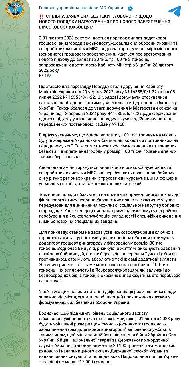 Ещё с 1 февраля 2023 года увеличат размеры ежемесячного (основного) денежного довольствия (без дополнительного вознаграждения) военнослужащих таким образом, чтобы минимальный его уровень для бойца ВСУ, бойцов Нацгвардии и ГПСУ составлял не менее 20100 грн.