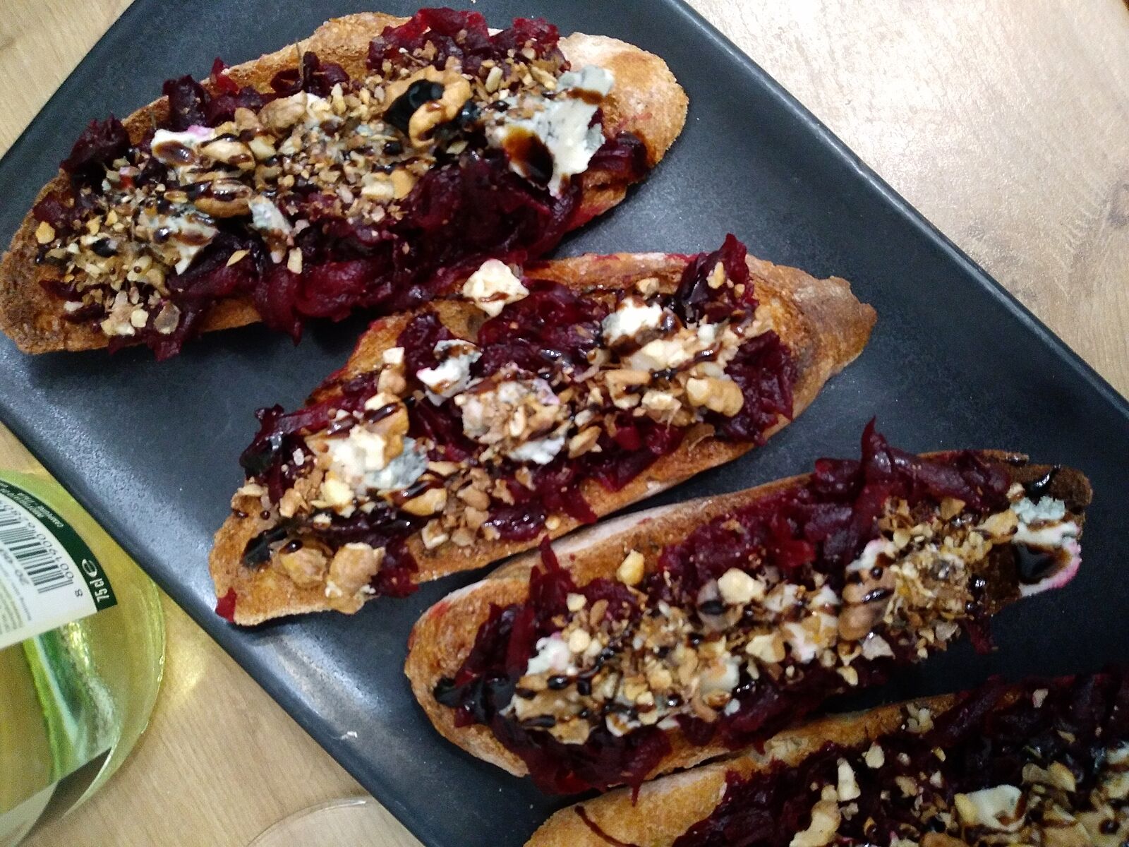 Как раз ужин подружке фоткала..арылышки буфало с сырным соусом и брускетты со свеклой,вялеными томатами,орехами,горгонзолой и кремом бальзамик.