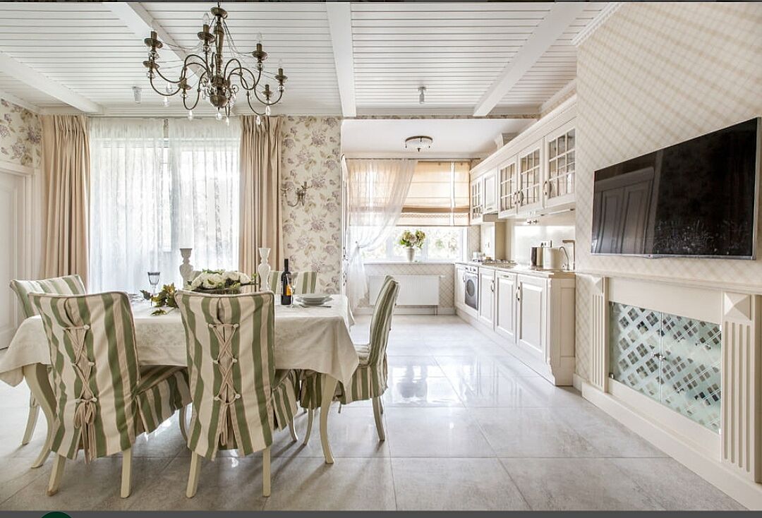 Я хотела гостевой дом в стиле Прованс, задумала в кухне-гостиной бежевые обои, голубые занавески...В итоге белые обои с бледно-серым рисунком и бежево-красный текстиль