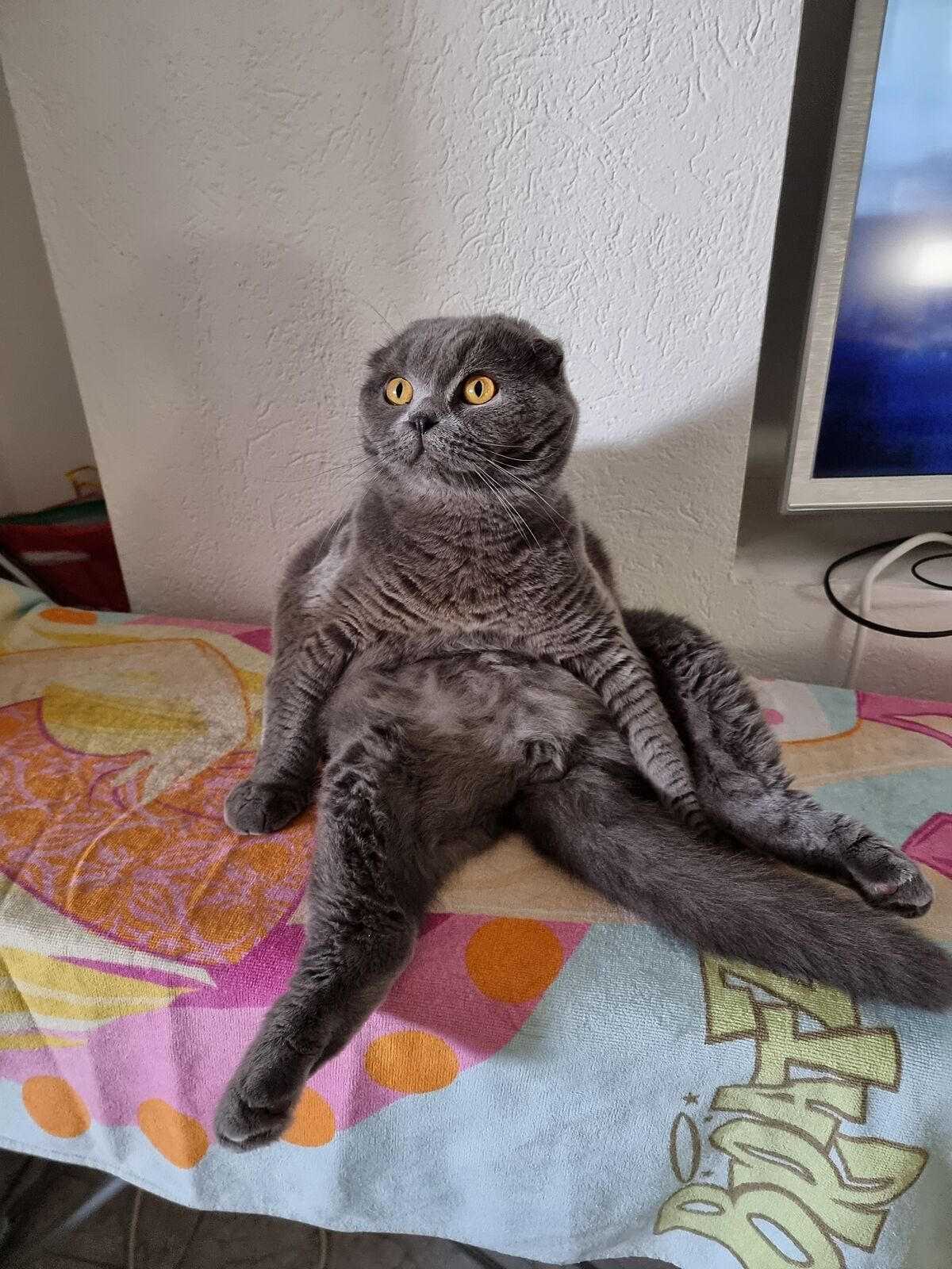 У родителей шотландец прямоухий, спокойный толстячок, руки не любит, но недолго терпит, с мамой у него любовь, детей избегает, но не обижает. Есть проблемы с пищеварением (запоры), он очень малоподвижный, хотя мы пытаемся его гонять. Малоподвижность усугубляет проблемное пищеварение.