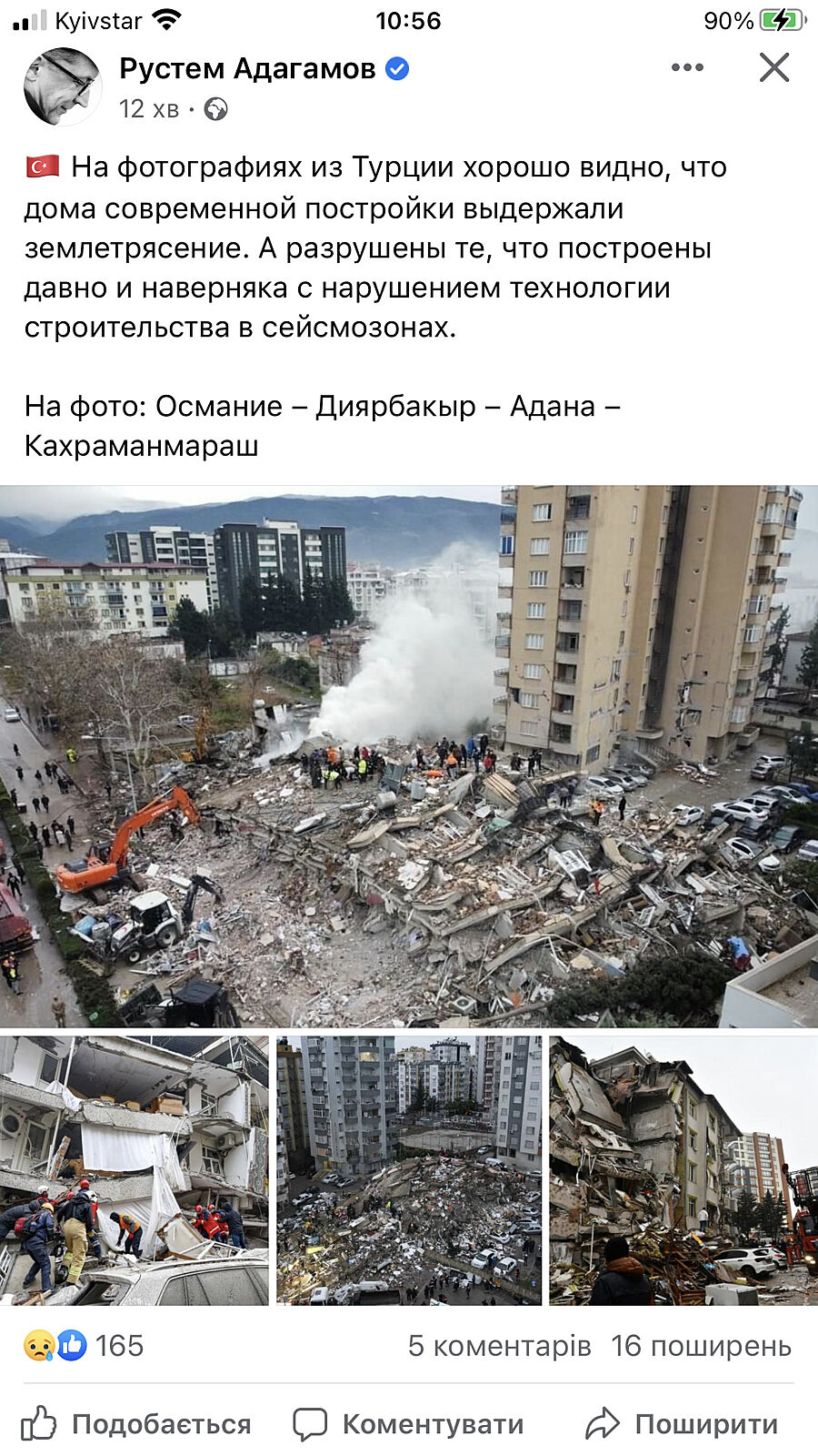 Я в Украине, все мужчины нашей семьи на войне, я вижу боль жён, детей и матерей на похоронах наших защитников, вижу разрушенные дома и судьбы мирных граждан и никакое землетрясение не может зацепить сильнее чем кровь и боль украинцев.