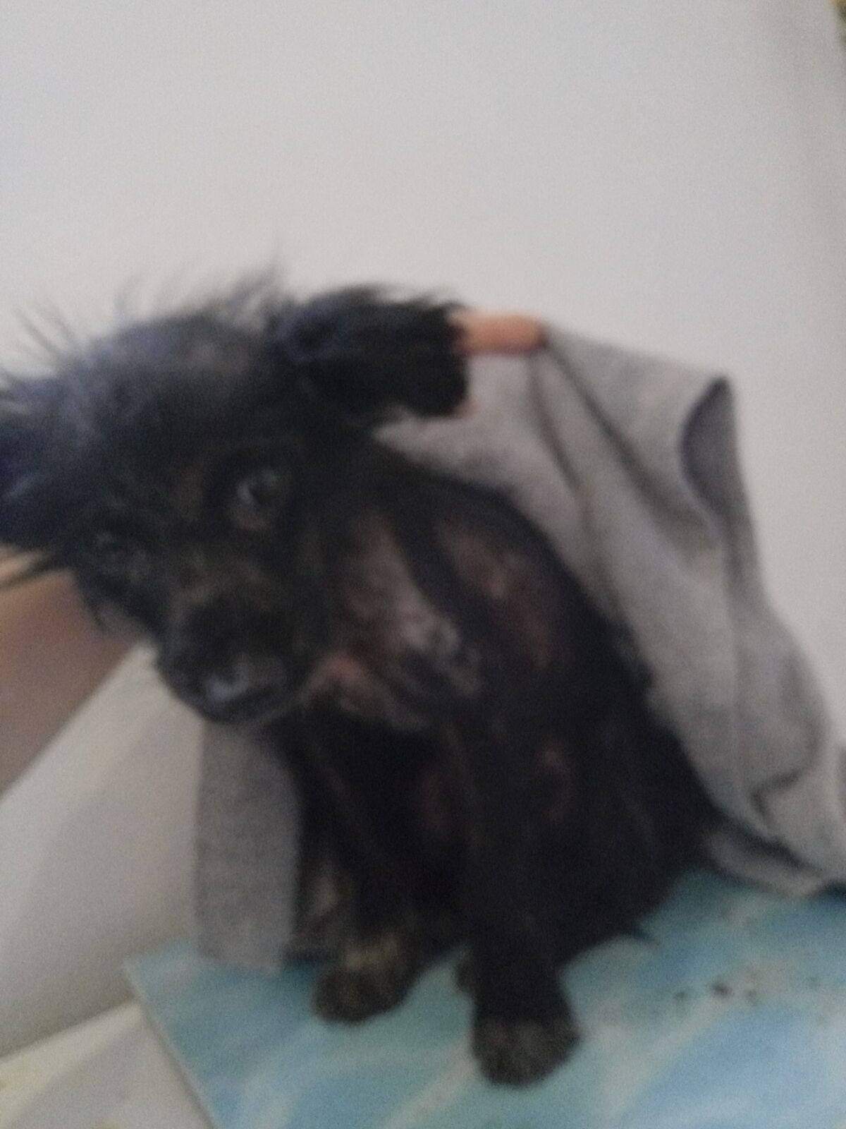 Щенок практически весь лысый и в язвочках... Сидел на холоде, трусился.... Не смогла пройти мимо. Попасть к ветеринару смогу только в субботу. Дома есть два кота и собака на улице. Этого щенка поместила в коробке с старой курткой на овчине, закутала как в гнезде. Поел плохо. Сидит там греется, не вылазит. Поел немного кошачего корма, колбасу (варёнку) не захотел... Я вот думаю, что это за болезнь у него? Клещ подкожный или ещё что то... Насколько опасно для домашних питомцев? Как долго лечится? Он почти весь лысый, местами торчат клочки шерсти и кожа в язвочках