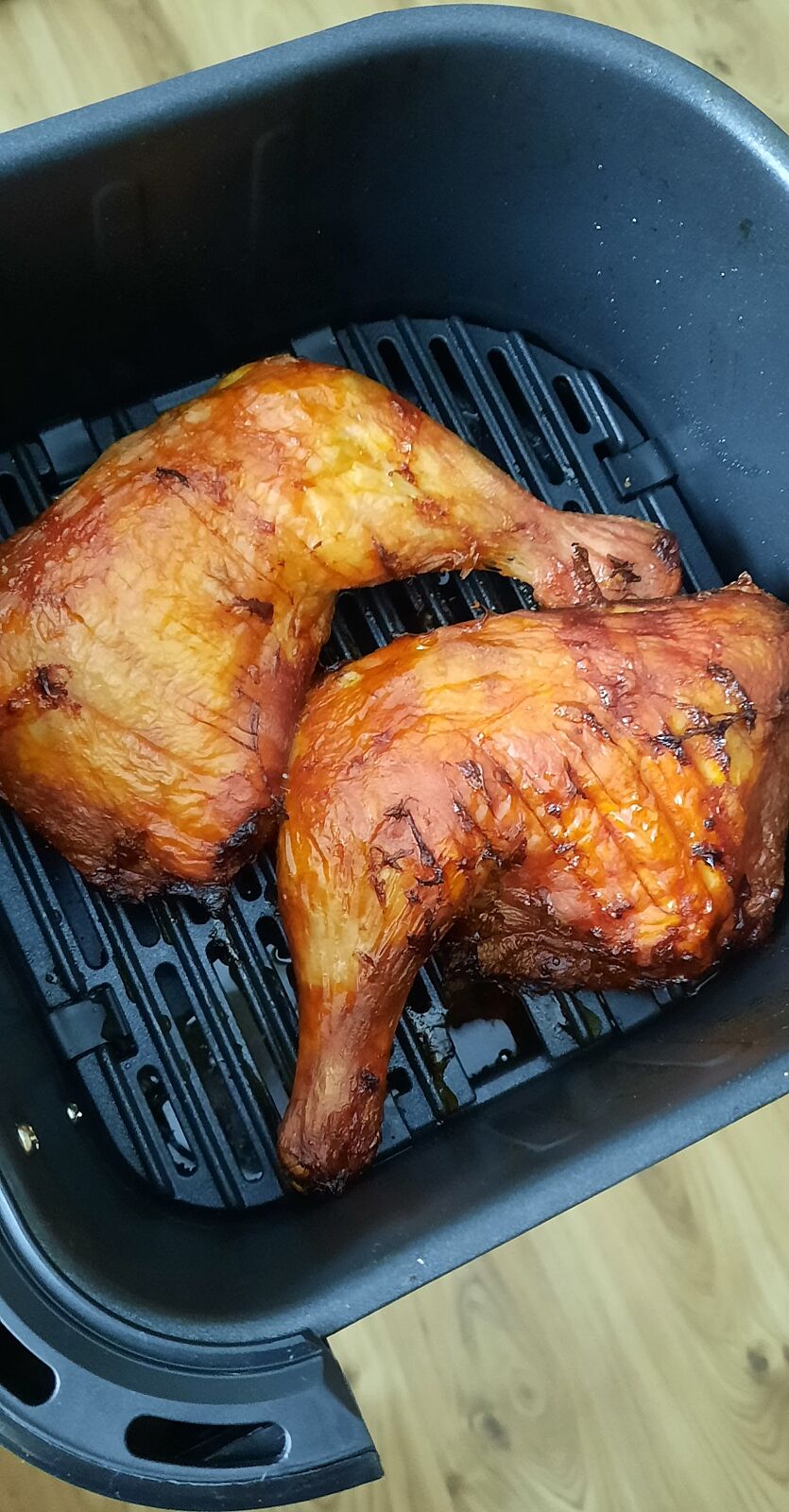 Конкретно ці курячі ноги виходять зі скоринкою, але м´ясо соковите + весь жир зтоплюється, риба теж соковита. Куряче філе роблю в паніровці або збризкую олією