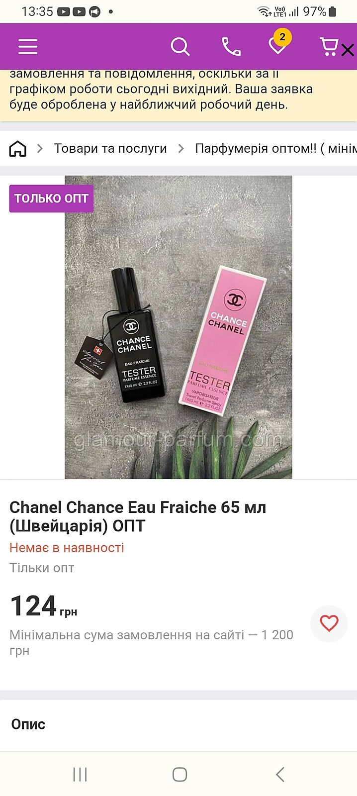 Це ж зелененький парфумчик в флаконі? Я зараз покажу Вам скрин на достойний аналог серед розливної парфумерії. Масла делюкс якості, Франція. Я розумію негатив до розливних парфумів, але вони різні, різний вміст і походження сировини. В кінці кінців 5мл 70грн на затест - то дуже доступно. Я багато кому радила і купувала аналоги в цьому магазині, ні одного негативного відгуку не було.