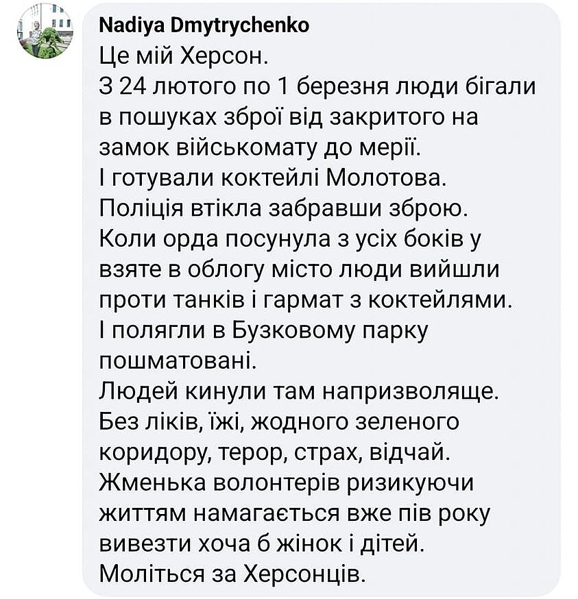 Я с Херсона, жила в нем до июля. Все видела и знаю. На работе у медсестры муж в Сиреневом парке был убит(((( сосед ( хороший дядька) бывший сбу выехал вроде за день до войны. Потом 5 рашистов приходили его искали , дочка моя с ними столкнулась( девочка, не бойся, на конфетку —фуууу) . Из органов у нас мчс остались и скорая. Полиции приказали выехать. Ко многим, кто когда то даже был у власти, военным— приходили с обысками, людей забирали, пытали, иногда выпускали. Мэр с нами оставался . Был параллельный мир: по одной стороне улицы наши флаги , на противоположной — рашисткие. Их машины, техника ( хотя машины наши, отжатые в автосалонах и наклеенными зетками) туда сюда по улицам шныряли . Ну и тд