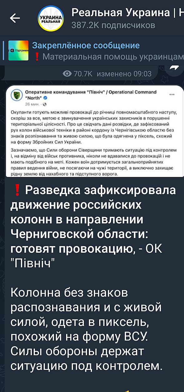 Колонна без знаков распознавания и с живой силой, одета в пиксель, похожий на форму ВСУ. Силы обороны держат ситуацию под контролем.