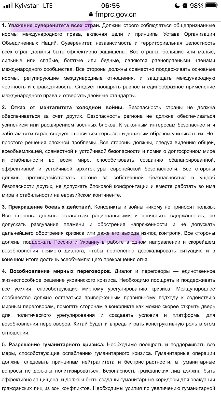 Вообще неправда. После визита в рашу с этим планом, русаки сначала сказали, что никакой план не обсуждали, а потом все таки назвали план ’так называемым’. Если бы Китай имел ввиду то, что вы написали, то раша зубами бы за этот план схватилась.