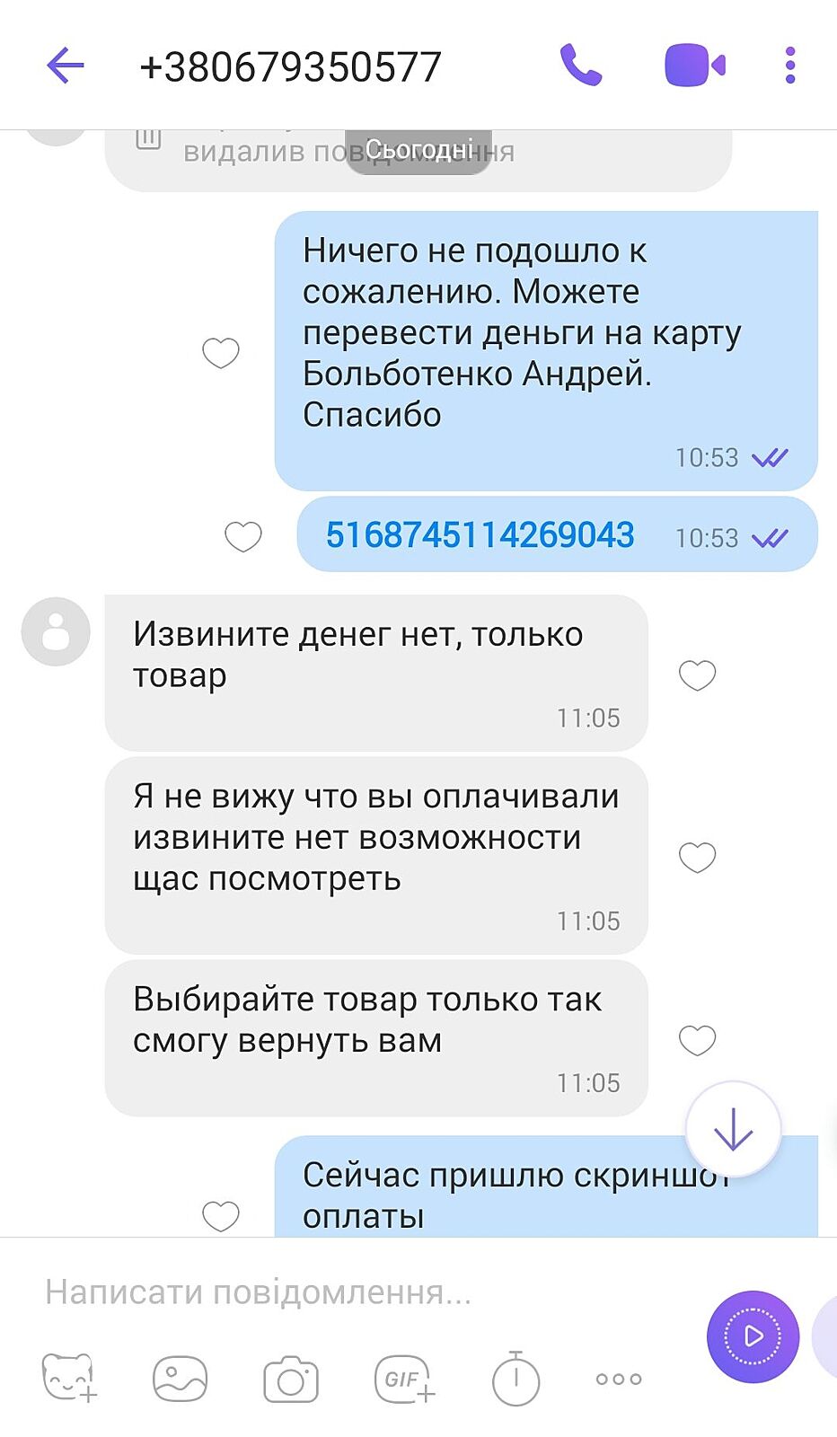 Девочки кто-нибудь может сталкивался с этим продавцом. Купила товар 399 гривен. Две недели мороза. Потом пишет этого товара нет выберите другой. Когда захотела вернуть деньги то как всегда карточка не моя. По телефону муж берет трубку и типа ничего не знает. В банк и киберпрлицию сообщили. Что ещё можно сделать?