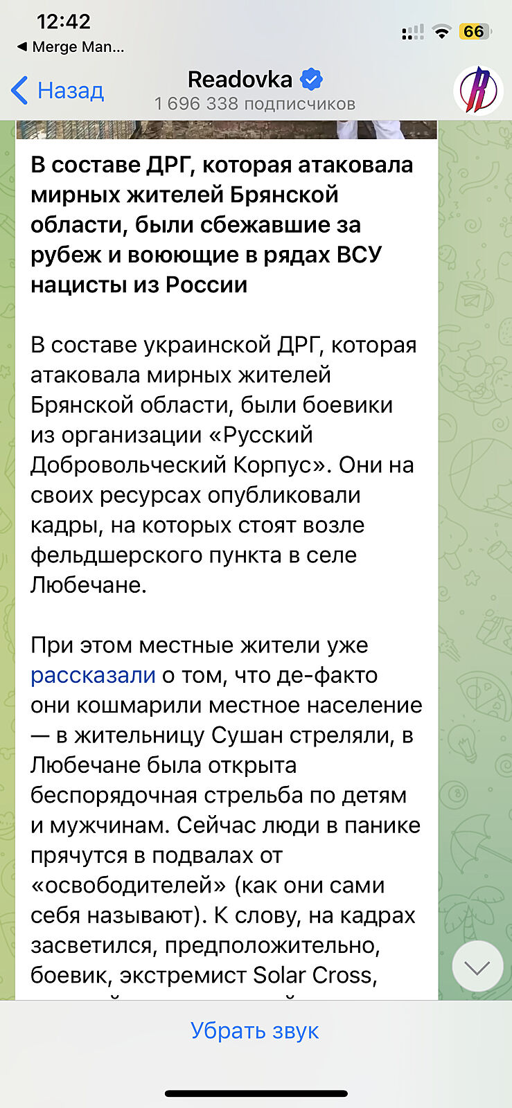 «Прямо сейчас вы можете увидеть новости об «украинских ДРГ». Всё это ложь кремлевских пропагандистов. Русский Добровольческий Корпус пришел в Брянскую область, чтобы показать соотечественникам, что надежда есть, что свободные русские люди с оружием в руках могут бороться с режимом».