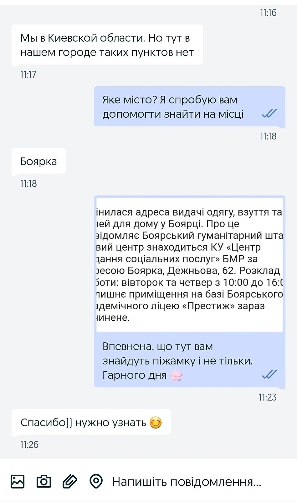 Дівчата, вона пише, що з Боярки і в неї немає там пунктів допомоги. Можливо щось підкажете? А раптом справді людина потребує