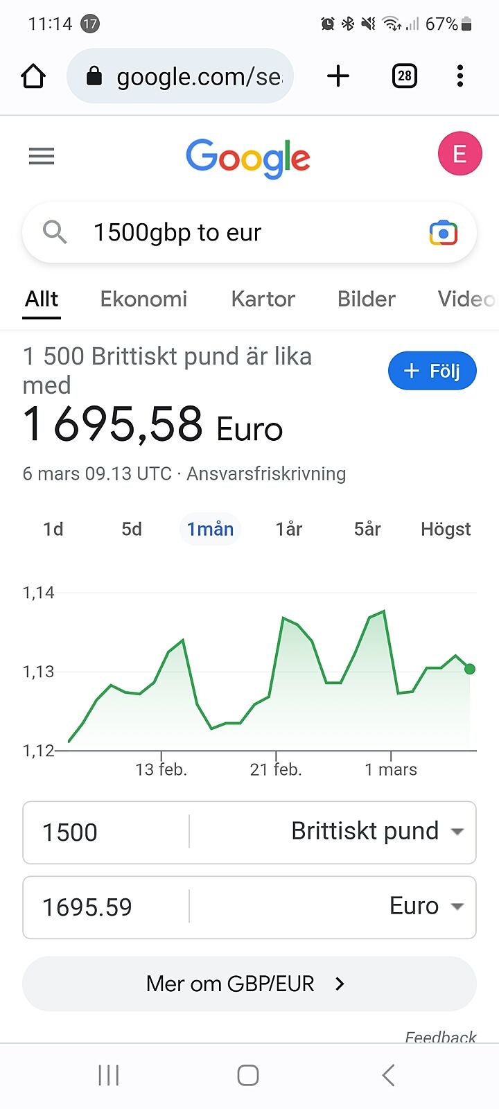 Нужно посчитать, сколько в 1500 euro фунтов стерлингов (GBP)